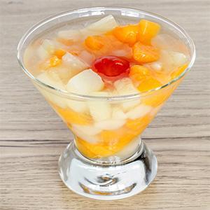 Salade de fruits au sirop avec son jus naturel, 4 fruits pêche, poire, ananas, raisin. (Pour votre santé, évitez de grignoter entre les repas)